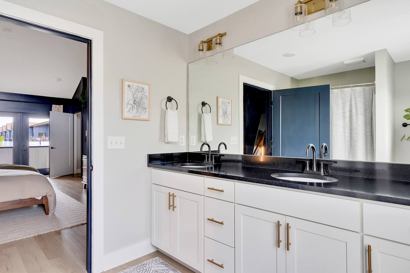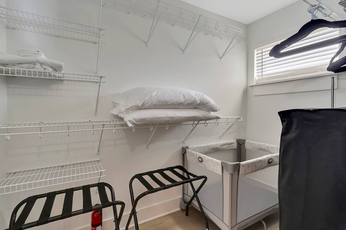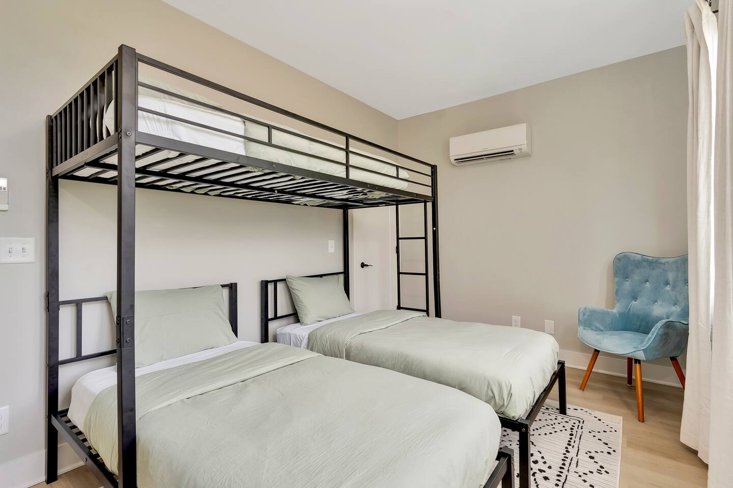 This spacious, 1700 sq ft townhome is split across three levels: Main Level: -Living Room -Dining Room -Kitchen -Half bath -Back Patio -Shared backyard Second Floor: -Queen Bedroom -Triple Bunk Room (3 twins) -Bathroom with double vanity -Washer and Dryer Third Floor: -Large Master Suite -Private covered balcony -Walk in closet -Bathroom with double vanity -Rollaway twin bed -Pack 'n play crib